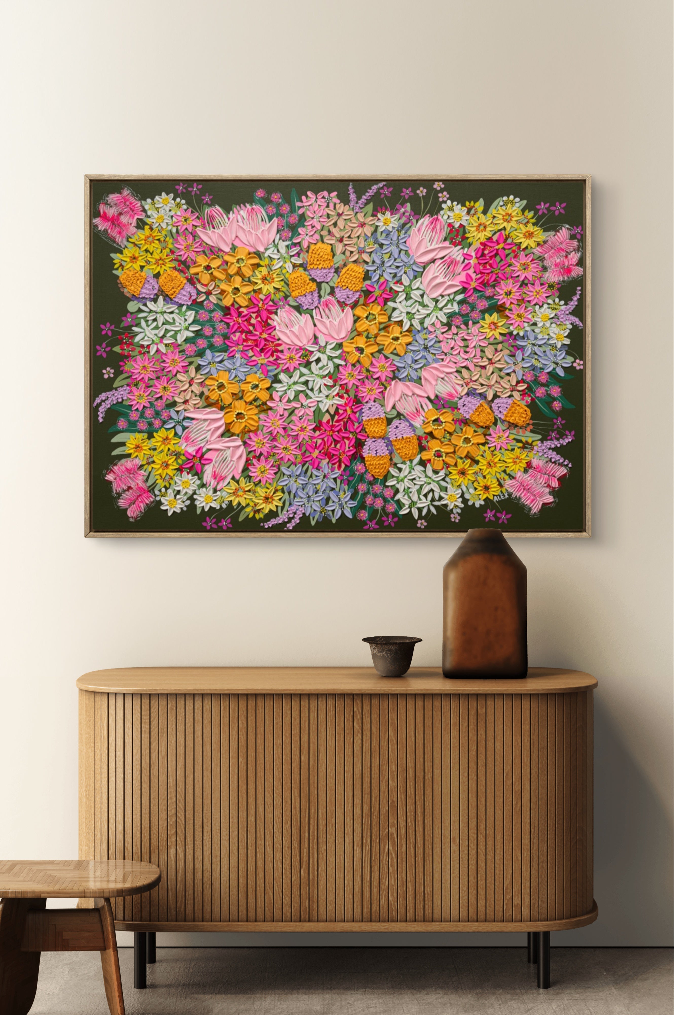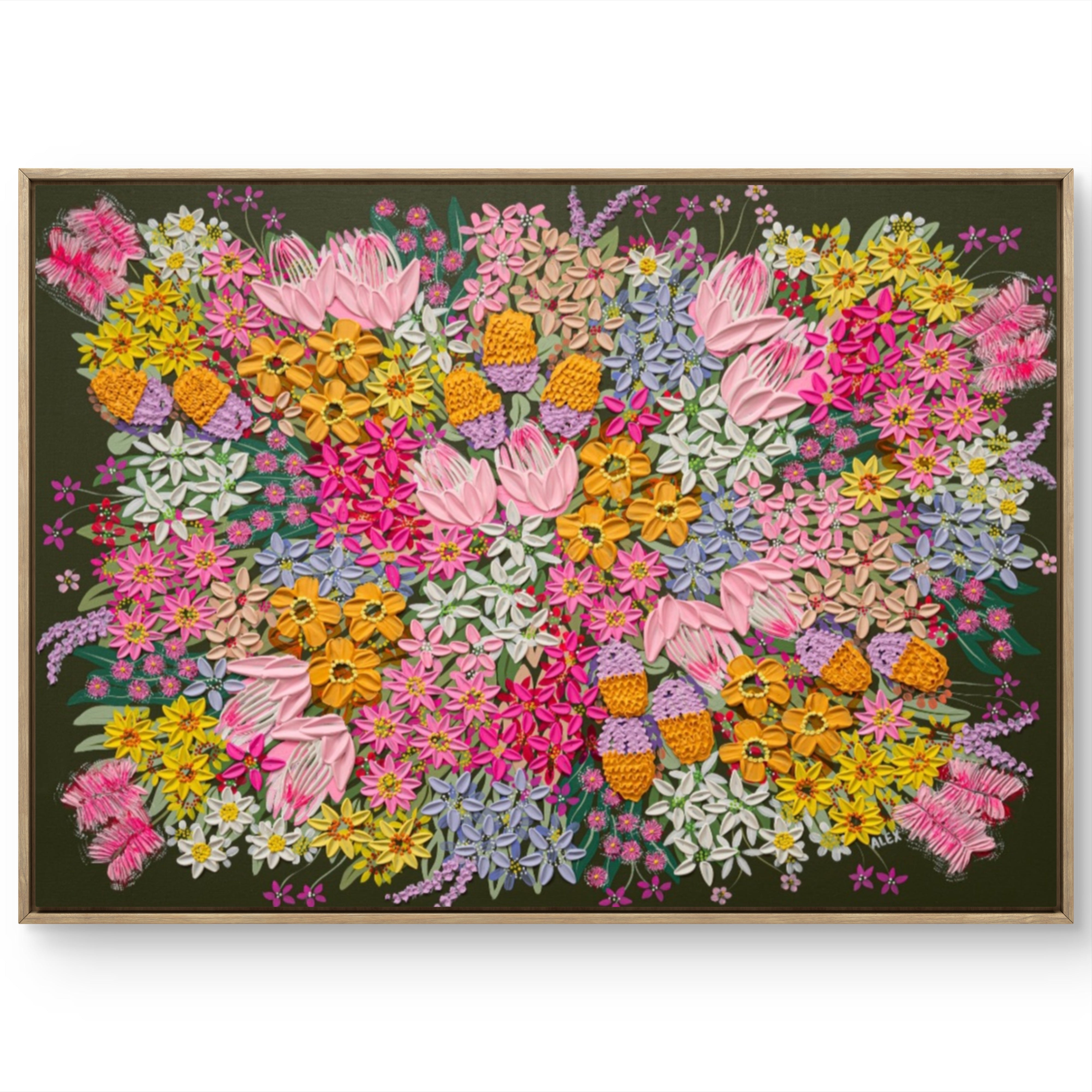 High quality, low sheen, 340gsm, 100% cotton canvas, printed at the highest resolution, hand wrapped to a natural timber stretcher by a craft framer and installed into a float frame made in Australia, using the finest quality Tasmanian Oak. All timbers are FSC certified.