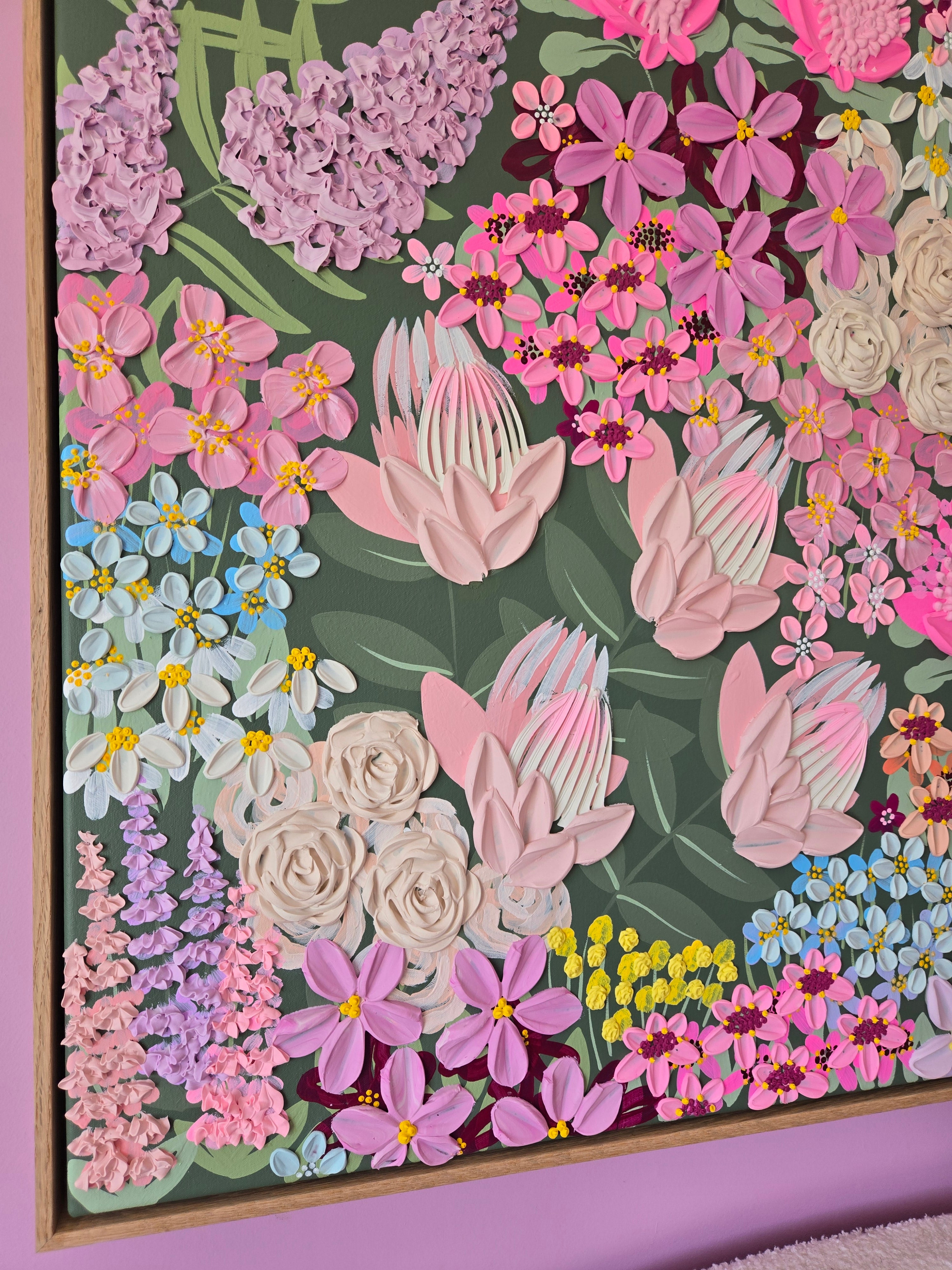 Original artwork by Alex Mason. Acrylic and textured paste on canvas. 120cm x 90cm with a professional Tasmanian Oak floating frame, ready to hang